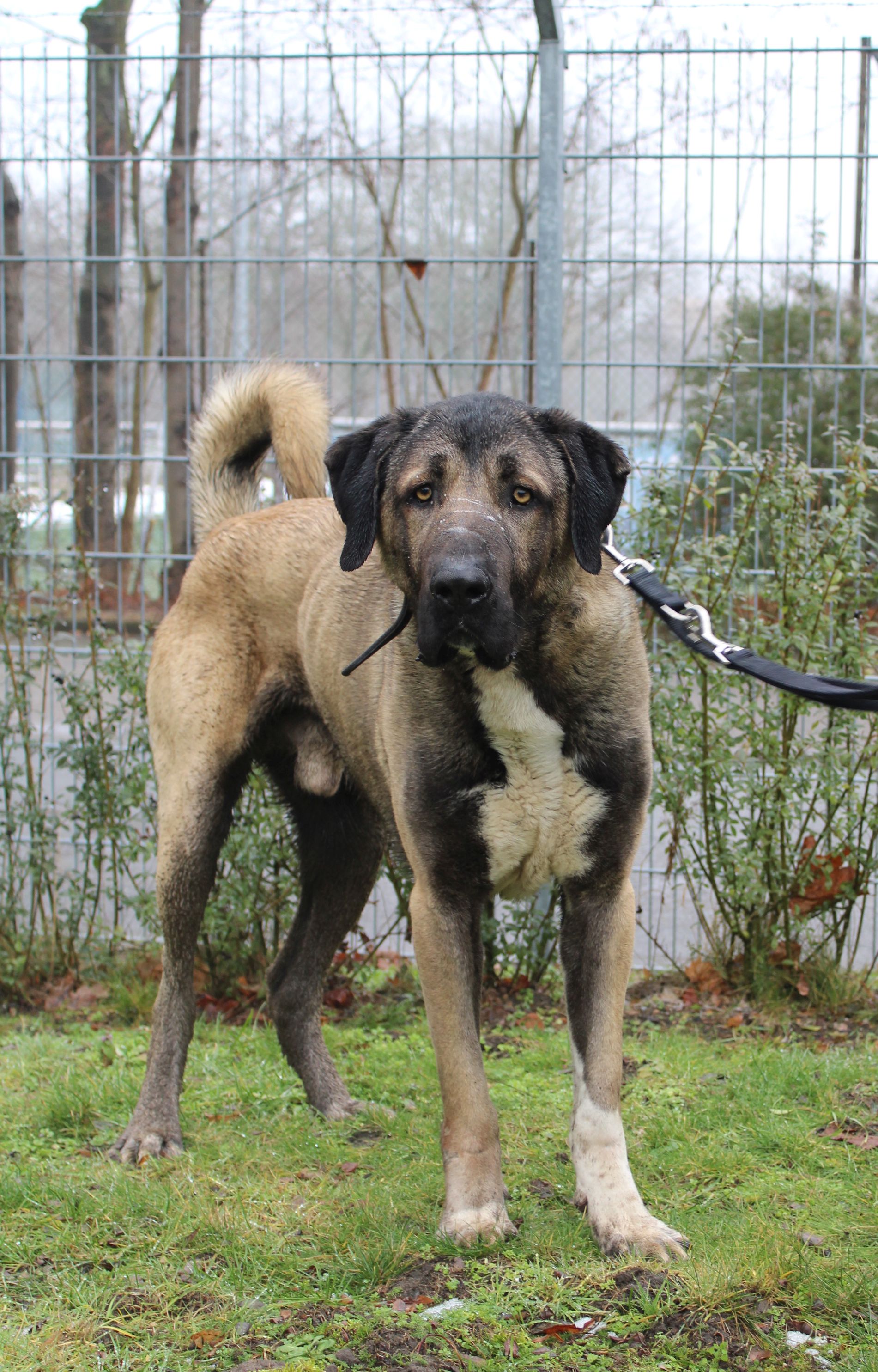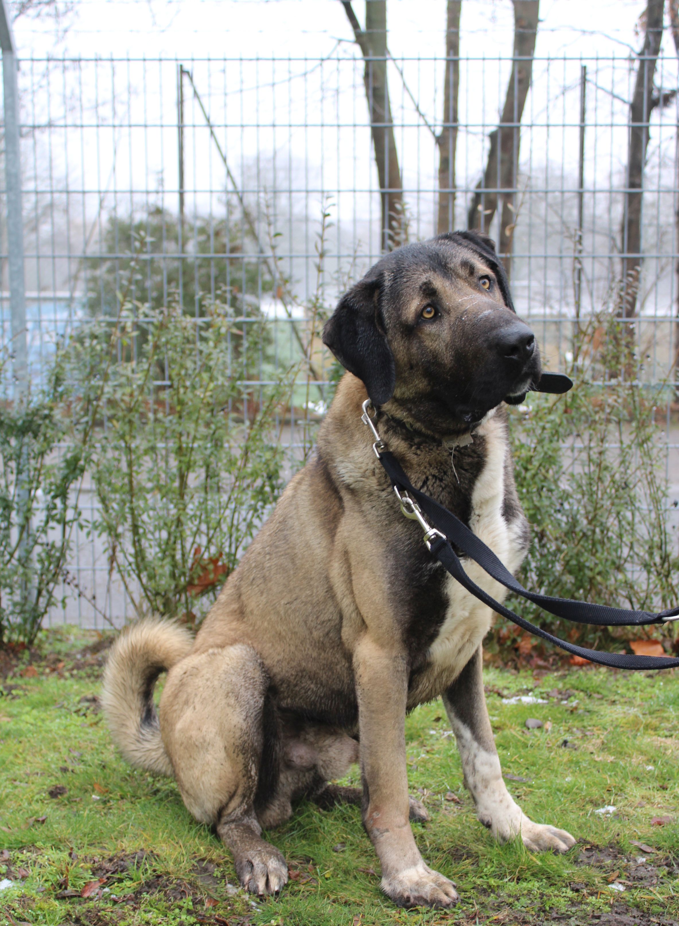 Ates ist ein temperamentvoller und kräftiger Kerl, der in seinem Leben bislang keine Grenzen gesetzt bekommen hat. Er ist extrem körperlich und er wird auch schnell rüpelig gegenüber Menschen und anderen Hunden. Ates springt Menschen an und er beißt auch schon mal gern in die Ärmel einer Jacke. Bei seiner Größe und seinem Gewicht stellt das schon ein Problem da. Ates ist leider auch nicht leinenführig und er pöbelt auch viel gegen andere Hunde, was einen Spaziergang nicht einfach macht. Der große Rüde wurde bislang nur zur Geländebewachung gehalten, daher ist es kein Wunder, dass er keine Ahnung vom kleinen 1x1 der Hundeerziehung hat. Hier haben seine neuen Besitzer noch ordentlich Arbeit vor sich. Ates ist nicht generell unverträglich mit seinen Artgenossen. Gegen eine Hündin an seiner Seite hätte er sicher nichts einzuwenden und bei anderen Rüden entscheidet die Sympathie.