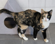 Josefine ist als Katzenbaby mit einer Lebendfalle eingefangen worden. Sie hatte eine verwilderte Mutter und dementsprechend scheu war sie in den ersten Monaten. Mittlerweile hat Josefine gelernt, dass Menschen sehr nett sein können und sie kuschelt schon mit Personen die ihr vertraut sind.